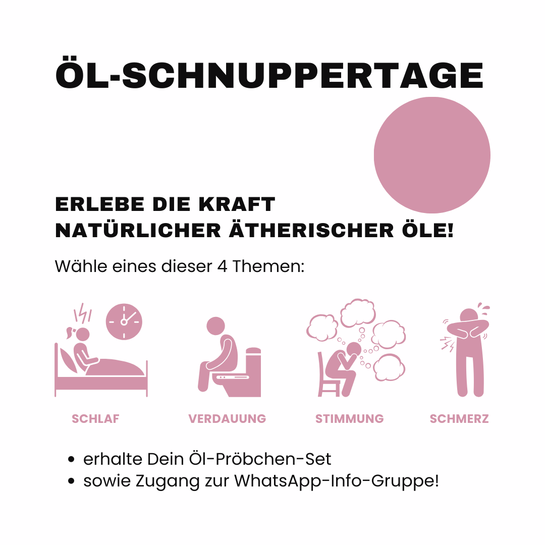 Du wählst ein Thema und bekommst von mir 5-6 Öl-Pröbchen zugeschickt. In einer WhatsApp-Gruppe erhältst Du dann eine Woche lang täglich Infos und Tipps zur Anwendung, sowie einen Live-Call und eine persönliche Beratung zum Abschluss.